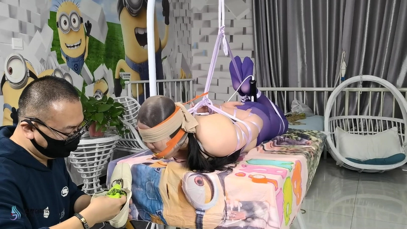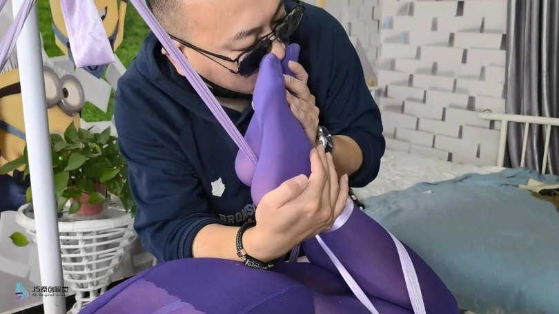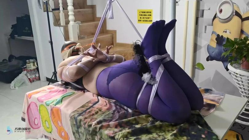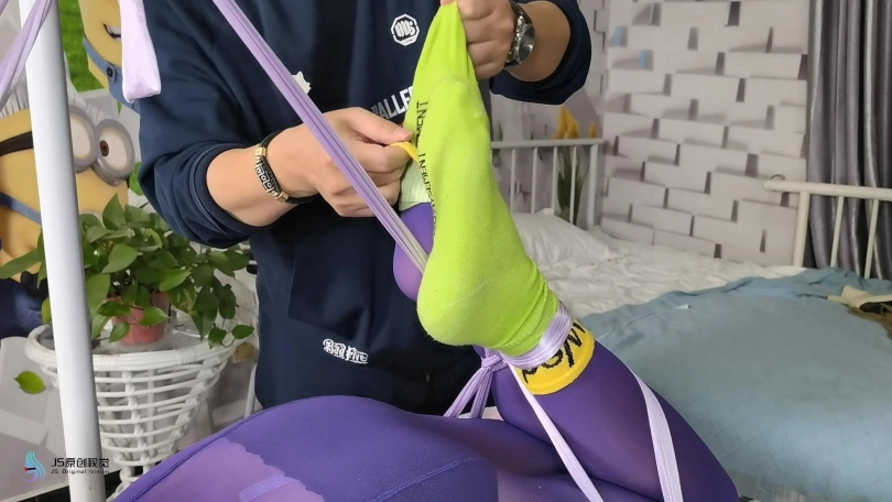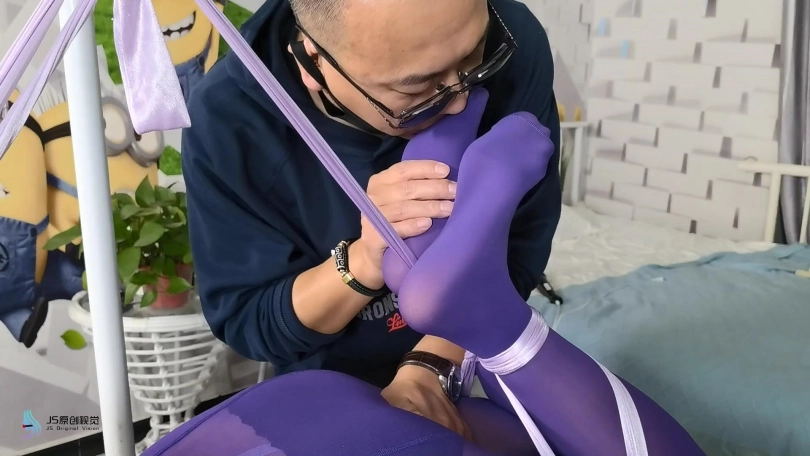 女人被脱去外套,被丝绸驷马捆绑在桌子上。男人将她的棉袜脱下,一只塞进她的嘴里,再套上丝袜头套,外面用胶带缠绕放置她吐出袜子。男人贪婪的亲吻玩弄着女人的丝袜双脚。在她的下面放着棒棒刺激着女人。男人将另外一只棉袜塞进一只靴子里,然后放在女人的鼻子上固定好。让女人闻着自己臭袜子和靴子的味道,享受着棒棒刺激带来的快感。
