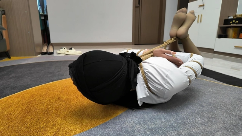 佳佳练完瑜伽在沙发上玩手机,一会困了就躺沙发上睡着了,此时房间溜进一神秘男子,佳佳迷迷糊糊发现有人在抚摸自己的丝足,不由惊醒大声问道,你是谁,神秘男子快速从口袋拿出毛巾将其捂晕,慢慢放到沙发上,这下可以尽情抚摸丝足了,时不时还抚摸一下酥胸,满足之后...把佳佳驷马捆绑,丝袜堵嘴,丝袜套头,扬长而去