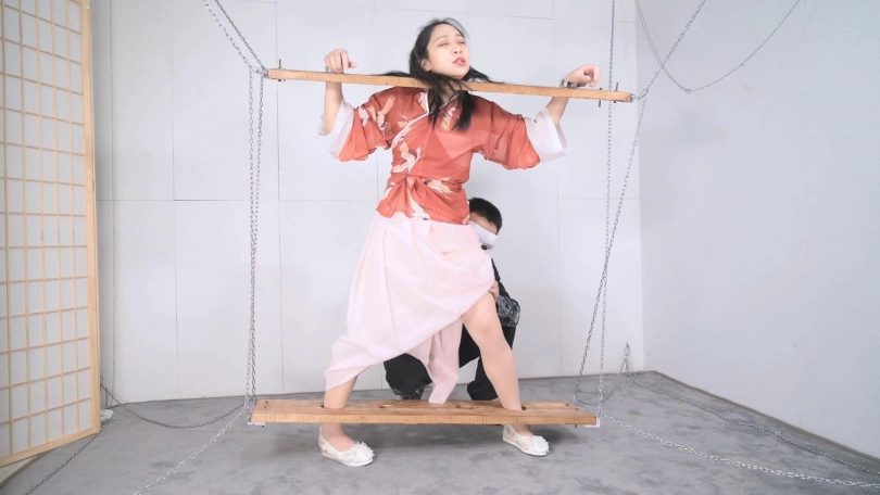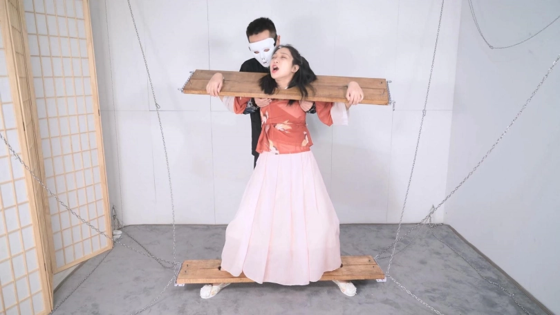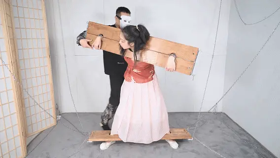 这套古装好似有魔力一般,沐小雨穿上就像戏精附体,表演欲爆棚,我这老演员都差点没接住,微剧情有点意思,不做过多介绍。单说这木枷组合,头一次用铁链连接吊起,固定作用明显,还有足够活动空间,据说古代犯人带着木枷时间过长,能够被活活卡死,我不太相信!于是顺着她的剧情,把沐小雨和木枷一起解下来,还真让她找到了求生姿势,就不知道如果戴着我这套厚重木枷能坚持多久了。