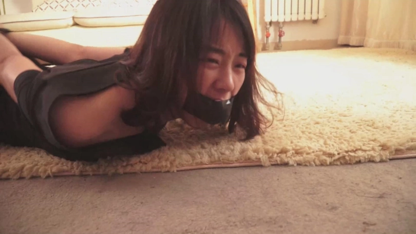 这个人被紧紧的用绳子拘束在一把椅子上,脸上被胶布紧紧的密封着,几乎只露出眼睛和鼻子。只看着她努力的
