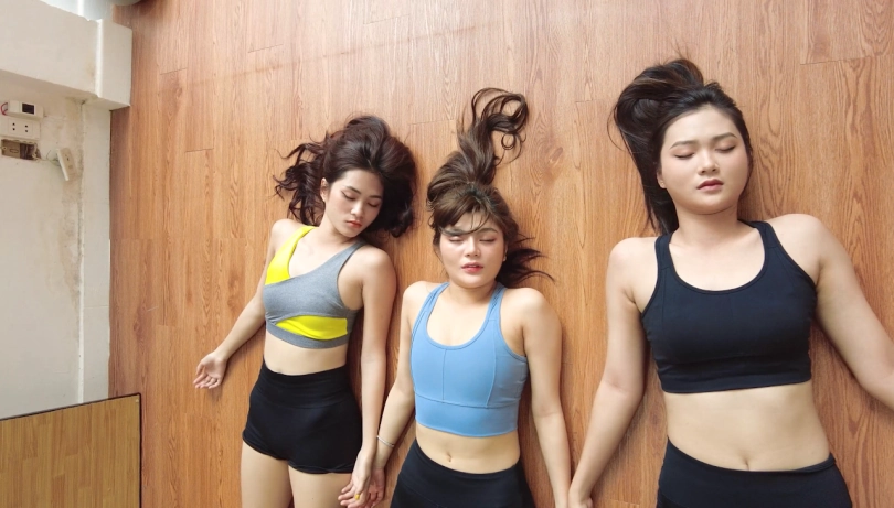 Julie (Black Top), Eva (Gray Top) vs Mimi take turns executing each other. The first scenario is 2 girls take out 1. The 2nd scenario is 1 girl taking out 2, The 3rd scenario is 3 girls fighting each other and all getting taken down, and the 4th scenario is the cameraman taking out all girls. The cameraman then removes the shoes and socks of the girls.