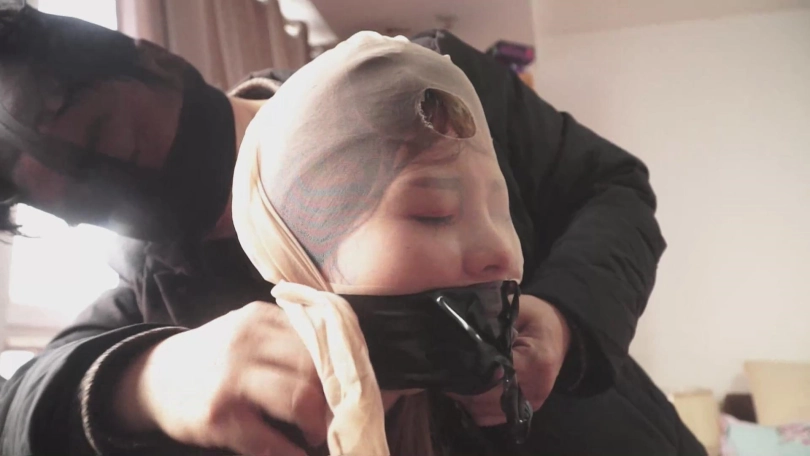 果然,徐萌把之前塞在自己嘴巴的丝袜都塞进张晴的嘴巴,又用胶布把张晴的头和嘴巴和自己一样包住。