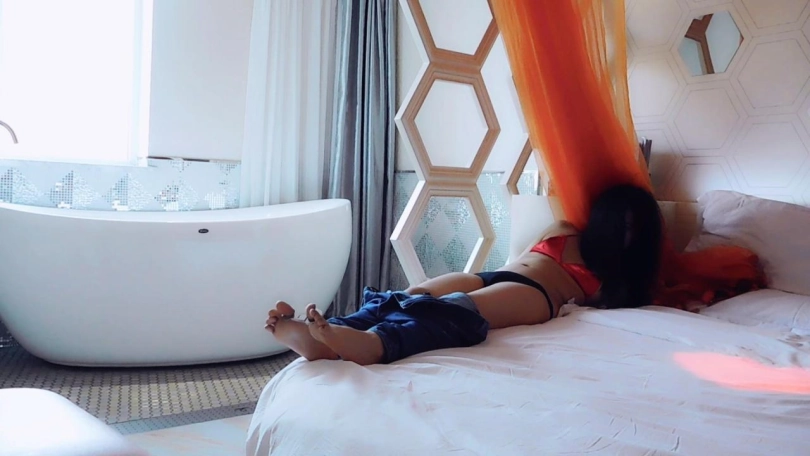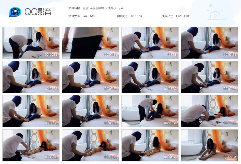 妹子在等朋友回来,然而劫匪缺撬门进入,把她弄到床上上,手背后锁住吊起来,脱下鞋,戴上脚铐,穿着袜子锁脚趾铐,挠脚心,逼问银行卡密码。挠了一会,解开脚趾铐,脱下袜子,再锁上脚趾铐,继续挠,继续逼问。又挠了一会,解开镣铐,脱下衣服,只剩内衣,再锁上两个脚趾铐、三通,继续挠,直到妹子说出了密码,劫匪才离去,留下妹子独自挣扎。