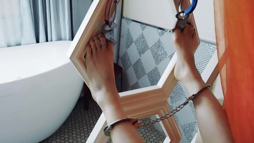 妹子一个人回家,看到了床上的镣铐,心想玩点刺激的事情,于是脱下鞋袜。锁住脚趾脚腕,塞入[不可描述],走到架子前,把一只脚拴起来,手上着钥匙,双手分别锁在栏杆上,钥匙拿在手上。妹子自己玩的很爽,扭动身体。妹子想解开手铐,结果钥匙掉在了地上。这下妹子惨了,企图用脚够钥匙,但是双脚被拴住活动范围也很小,而且还脚趾也被锁了,这下妹子可着急了,呼叫救命。男室友回来了,听到喊叫,马上前去,结果看到了此场景。问清之后,室友决定要挟妹子,让妹子以后和他一起玩,妹子无奈下只好答应,室友拿走了剩下的钥匙,并捡起地上的钥匙,放到妹子嘴里,离开。妹子十分惊恐,嘴里的钥匙看得见却拿不到,很着急。最后,坚持不住了,钥匙掉在了地上,妹子大叫并且哭泣。室友回来了,解开妹子,放在床上,把她双手锁在后面,双脚吊起来锁住,脚趾分别锁在一栏杆上,离开。妹子十分惊恐,一直求饶。室友回来了,挠妹子脚心,妹子一直扭动大笑。然后离开。妹子彻底被拴住了,非常难受,哭了。