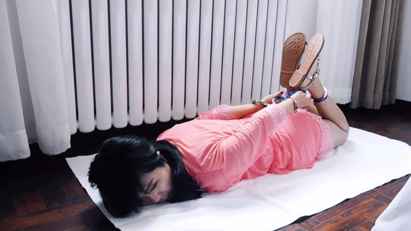 秘书在老板出差的酒店办公,觉得很无聊,一住吐槽老板。然而,突然发现一个脚趾铐,十分好奇,想问问老板这是做什么的。这时老板回来了,看到秘书在偷懒很生气。然而秘书却拿着脚趾铐问老板这是什么。老板见秘密被发现,十分震怒,要让妹子尝尝脚趾铐的滋味,直接锁上脚趾铐,然后离开。妹子被带上脚趾铐很难受,各种想拔下来,却没办法,下地走路企图活动下,却更疼。老板回来了,解开脚趾铐,脱下凉鞋,让妹子趴在地板上,驷马铐起来,然后离开。秘书很难受,说老板坏话,同时也在求饶。老板回来了,挠脚心惩罚,让秘书知道做人要有分寸。然后解开,把妹子一只脚用脚镣拴在柜子上,把手背铐起来,让妹子好好反思。这下秘书是彻底走不了了,一直在求饶。
