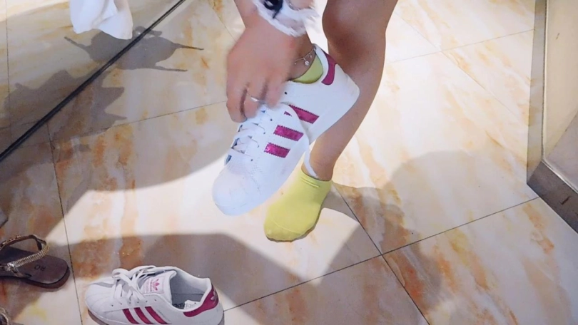 妹子来学舞蹈,一进门就被老师发现穿着小白鞋来,问舞蹈鞋呢?妹子说忘了穿了,于是被老师要求直接光脚上课吧,妹子脱下鞋袜。然而脱下鞋袜发现涂了指甲油,老师很生气,之前说了不让涂指甲油的。妹子狡辩,觉得指甲油挺好看的。老师决定惩罚她一下。让妹子带上脚铐和脚趾铐,然后让妹子走几步,当作惩罚。妹子带着脚铐走路,十分难受,并一直向老师求饶,并自言自语说还不如昨天认真听要求,就不会光脚了,也不会被发现指甲油。老师解开了脚铐,并开始了上课,首先练习绷脚尖。妹子脚趾合不拢,被问到,回答说脚趾铐弄得疼。老师感觉妹子做的很不用心,于是给她戴上脚趾铐,强制绷脚尖。妹子坚持了一会,并向老师求情。老师为觉得可以了,解开脚趾铐,下一步练习压腿,一只脚和拇指被铐在栏杆上。妹子坚持了一会就坚持不住了,向老师求情。老师决定要再惩罚一下妹子,挠脚心。老师看妹子手老乱动,后面铐上双手,继续挠脚心。老师让妹子站着坚持一会,妹子一直在抱怨。老师觉得时间差不多了,就下课了,希望妹子下次能好好学习,给妹子解开。妹子重复了一下明天的要求,揉了下脚趾,穿好了鞋袜,离开。