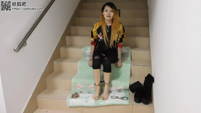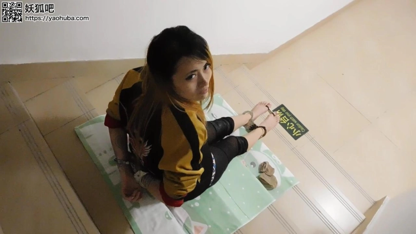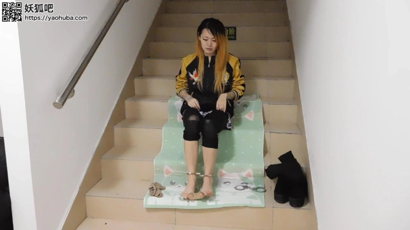 【趾间艺束】新片纹身女楼道镣铐展示 手铐脚铐脚趾铐