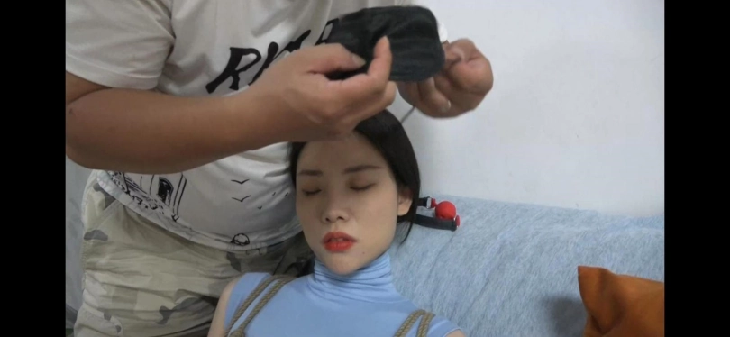 将刘小萌的上半身捆好之后,男子还不忘占一下刘小萌的便宜,脱掉她脚上的白色高跟鞋。开始把玩起她那双可爱的小脚丫,不停的抚摸着她的双腿,她的脚丫子。把玩一会之后,男子觉得刘小萌应该差不多该醒了,于是再次拿出一根绳索,将刘小萌那双丝袜大长腿紧紧捆在一起,戴上眼罩和塞口球。