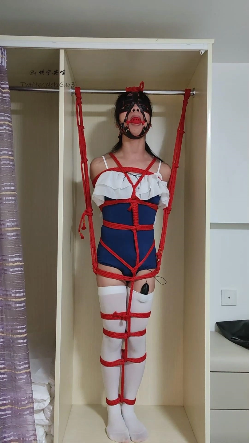 这是一期放置,但是衣柜强制站立!在某个民宿看到的大衣柜,刚好可以站进去一个我(1m6不到的好处√)!于是立马进行一个固定放置。马具口塞和晾衣杆连接在一起,只能强制抬着头,同时身体两侧也固定住了,既不会也不能摔倒,只能站着忍受下面训练器的折磨……