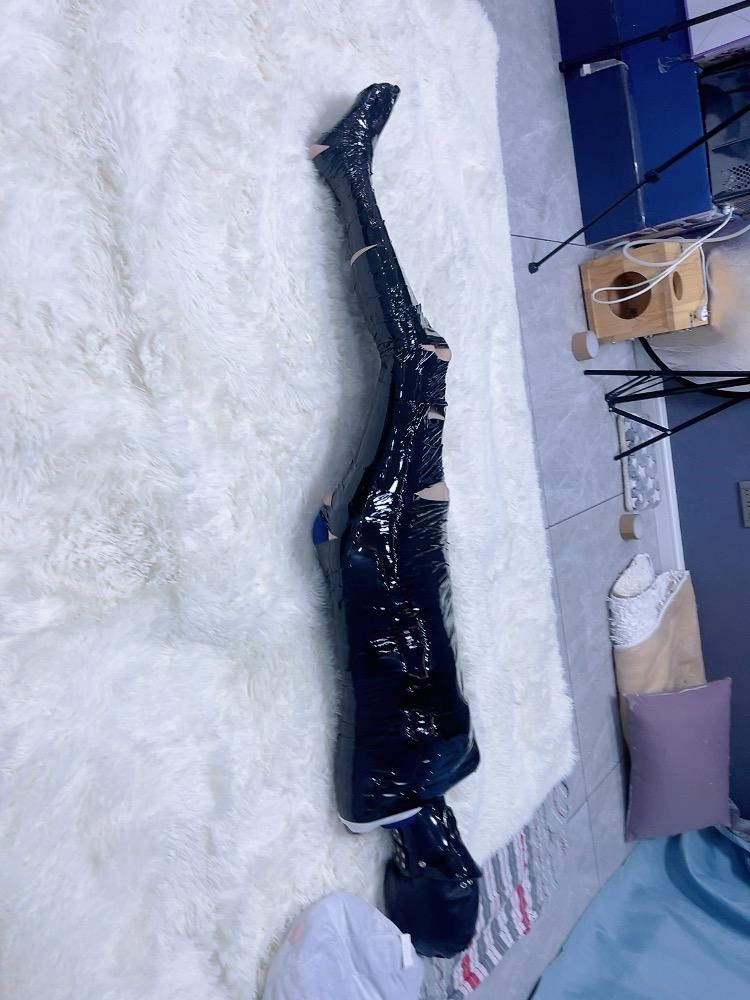 不过既然茶茶大言不惭,挑战一定是要有点危机感的:木乃伊全包之后脖子上还要带上强制抬头项圈,固定脖子的同时还能限制呼吸。然后头套里也套上两层丝袜、带上鼻夹后补一个呼吸限制皮革全包头套。