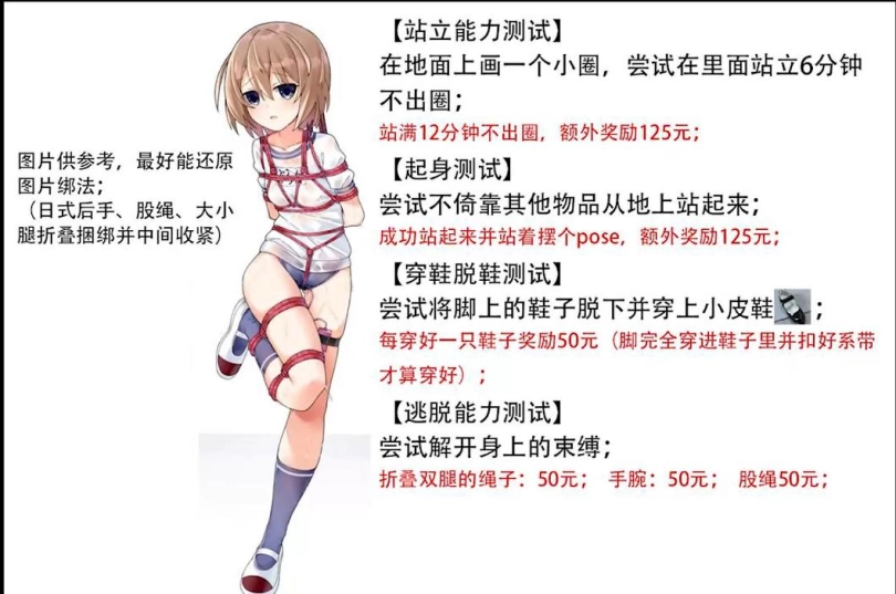 本作包含四个小实验,模特需要按照图片中的绑法被捆绑后进行测试,达成额外条件也有相应奖励,一起看看测试过程与结果吧;