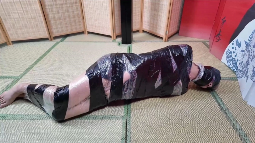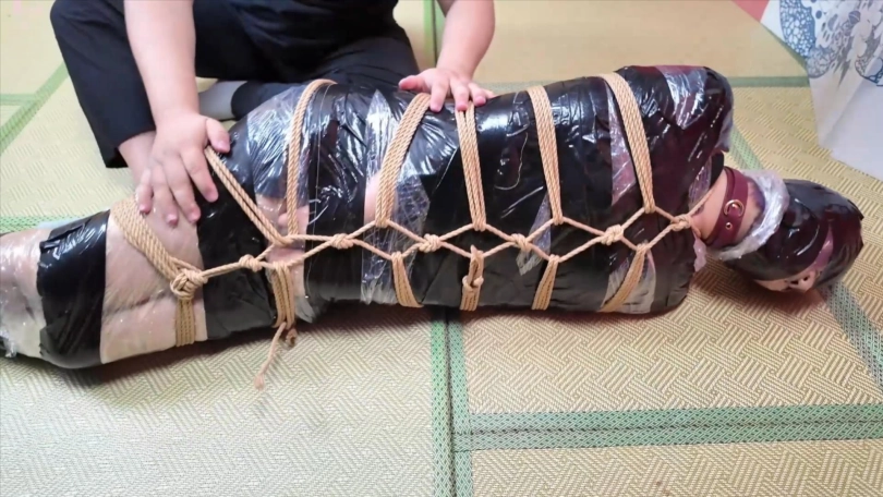 再用保鲜膜包住她的身体,外面用胶带缠绕,