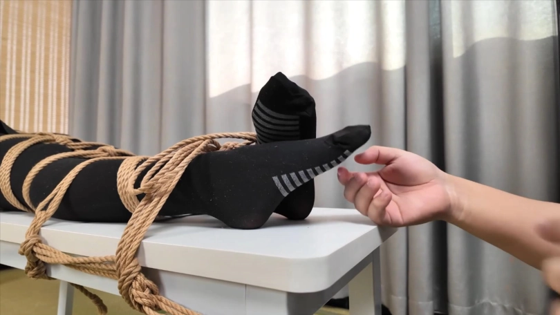 欣赏她挣扎的样子,最后穿上高跟鞋固定再柱子上。