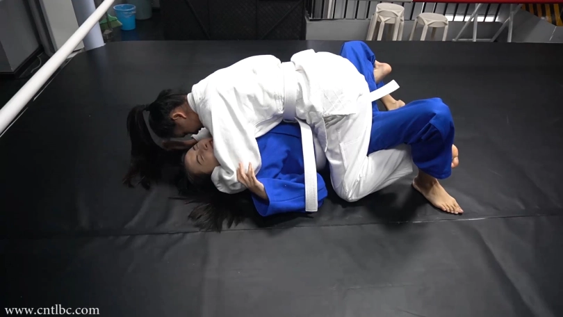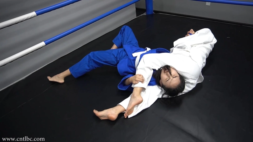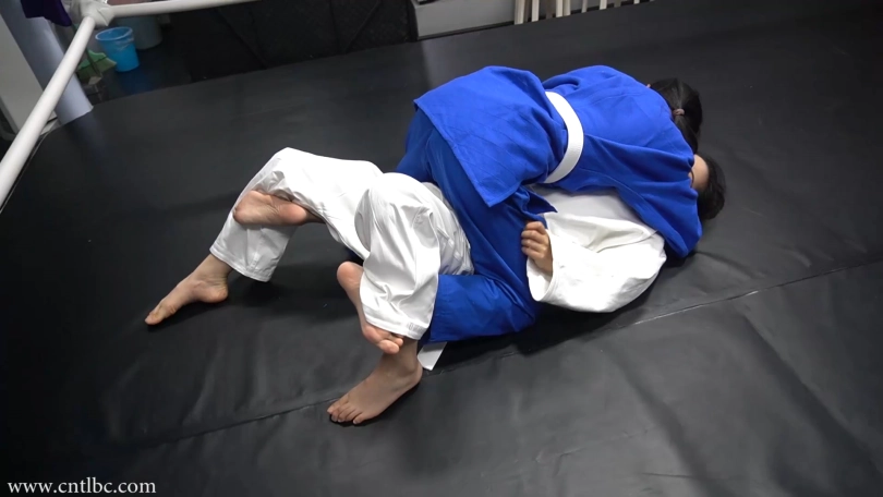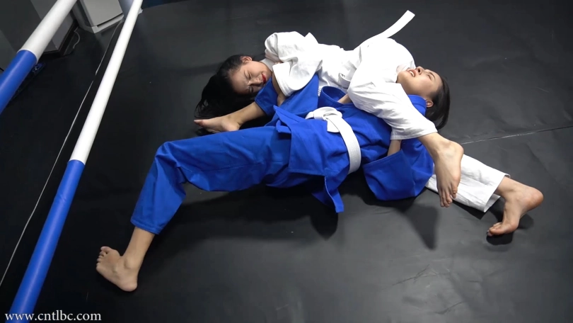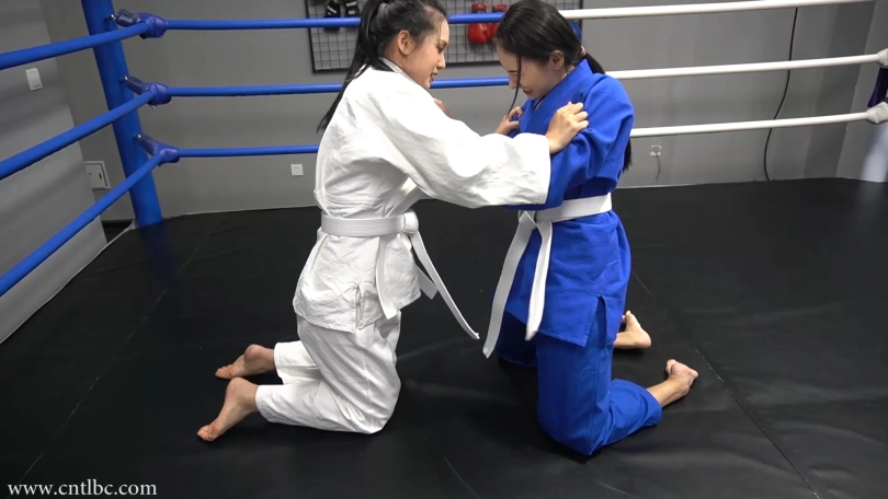 Jiao and Ting had a judo match. Wearing judogi, they started the match with a friendly attitude. They started on their knees. They used a lot of judo skills to try to subdue each other...