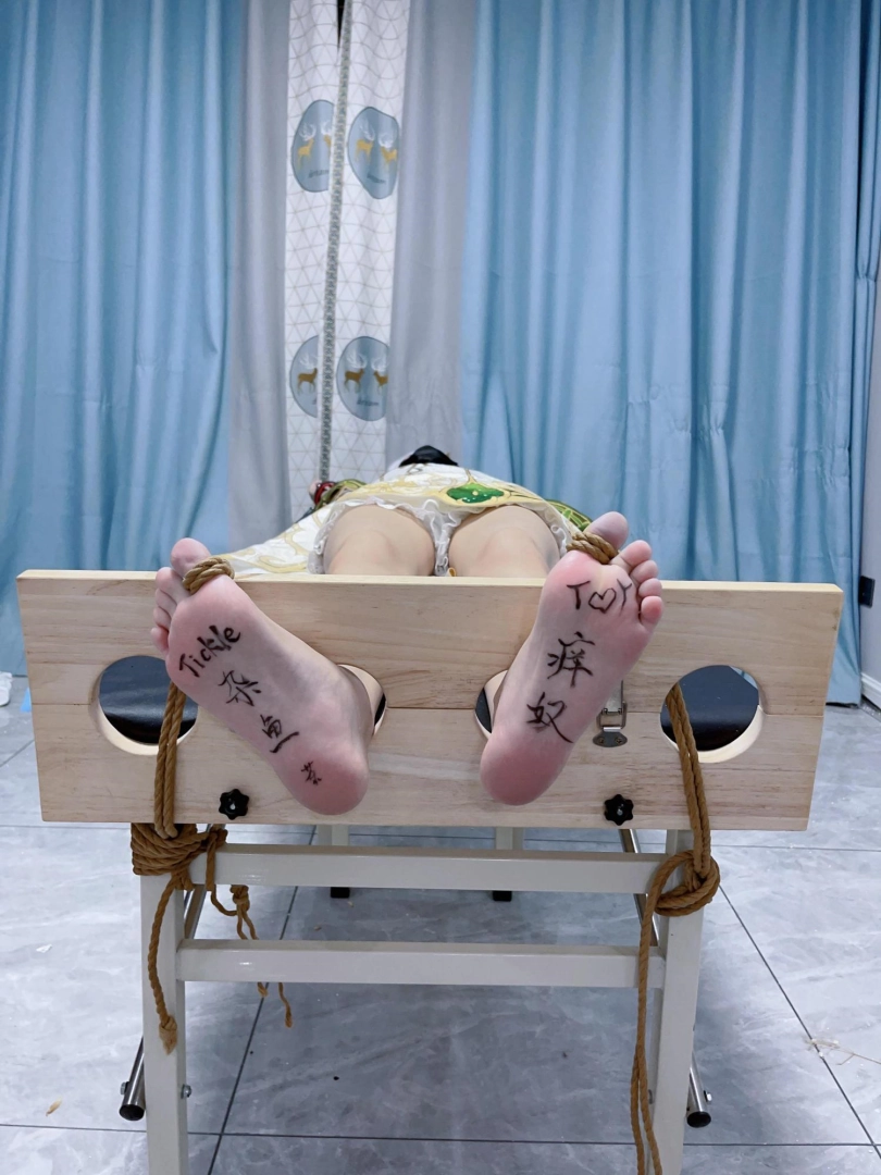 内容:先让茶茶穿着小草神纳西妲的cos服固定在痒刑床上,足枷锁好后用绳子固定好脚趾禁止乱动一丝一毫,然后在脚底写上羞耻的文字(杂鱼痒奴)(Tickle Toy)。