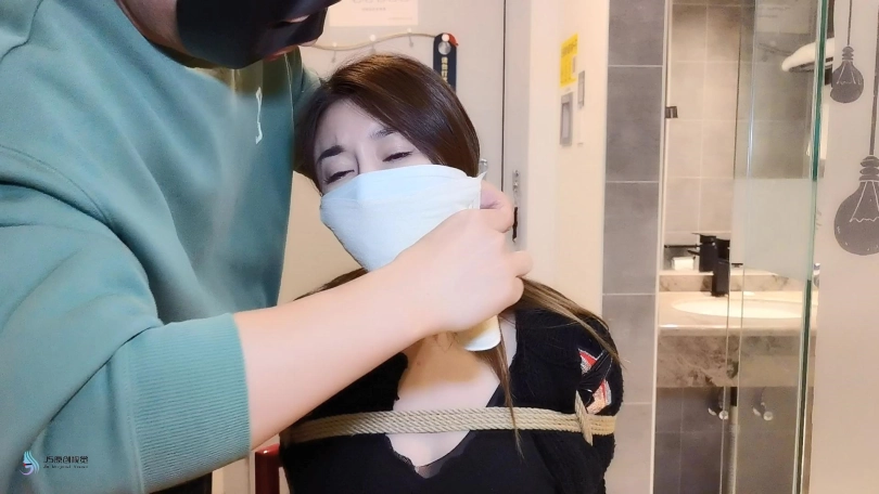 把艾菲绑在椅子上,先用丝袜堵嘴,外面用胶带封嘴。捂住她的口鼻限制呼吸。戴上口罩,然后外面在缠绕绷带。艾菲呼吸很困难,不断的在椅子上呜呜挣扎。。。