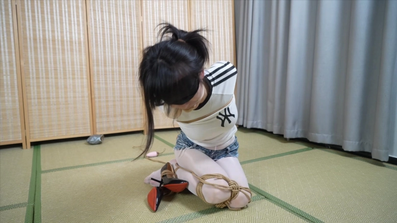 双手被胶带缠起来以后做并肘直臂,大腿小腿脚腕鞋子都用绳子加固