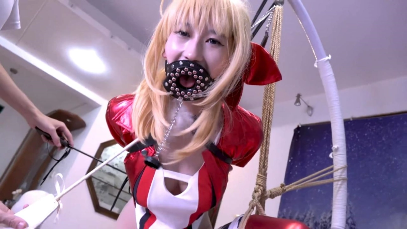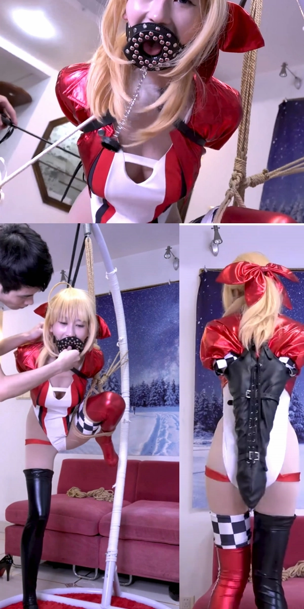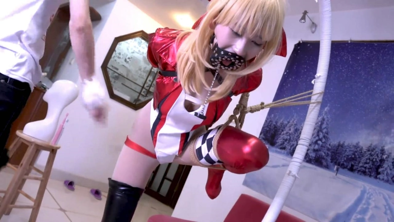 【逍遥】【cosplay TK】新人妹子赛车服尼禄TK体验 双色皮袜大长腿,口塞口球单腿吊,拔掉塞子流口水,胸部夹枪被挠哭