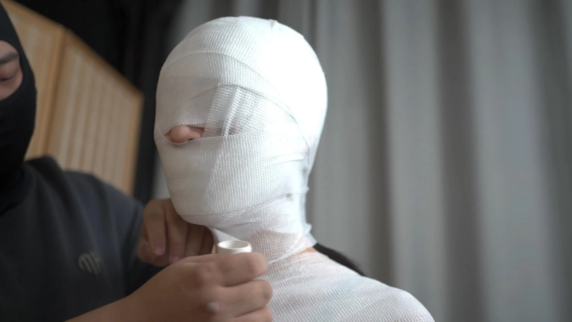嘴巴用丝袜堵嘴,然后把头部包紧实,胳膊用直臂的方式包在一起