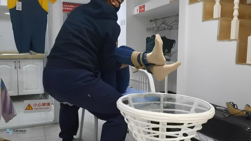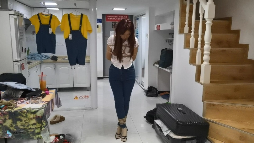 着装:白色长袖衬衣,深色牛仔裤,里面肉色油光丝袜,脚穿高跟凉鞋,然后上身捆完后走上一两圈,然后将晓凡双脚交叉,把腿脚捆在一起。站着问一个问题:感觉现在的捆绑姿势难不难受?能坚持多久?你会不会觉得自己被绑起来很漂亮?