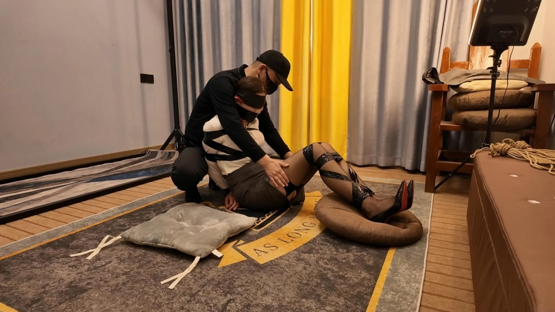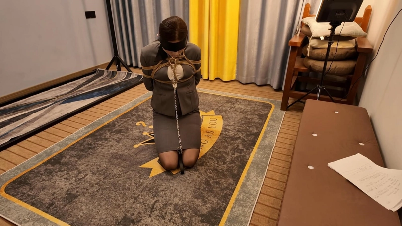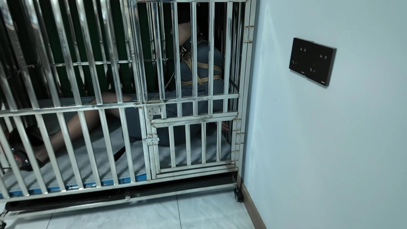 先把佳佳日式紧缚,关到笼子里面,等待客户到来体验,到了之后把佳佳从笼子里面牵出来,由于时间长了,佳佳双手早就麻木了,解开稍微休息了一会,先胶带捆绑,胶带缠绕嘟嘴,由于胶带堵嘴,和缠绕过于显得佳佳胸部很丰满,客户控制不住对佳佳上下其手,摸得佳佳呜呜只叫,胶带缠的太紧,不一会佳佳手就受不了,解开手之后,嘴都没有打开,就瘫软到地上