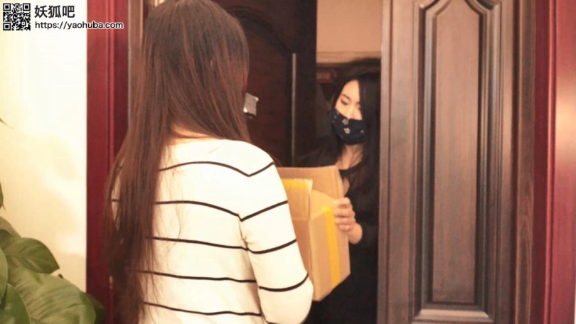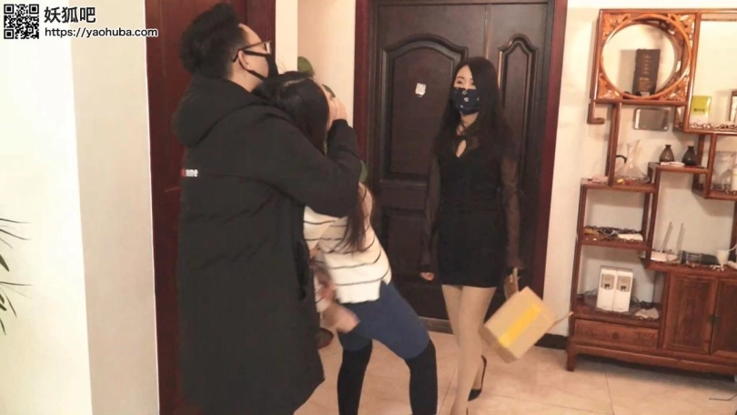 2. 刚回到家,她先在沙发上小休一会。此时门铃向起,她不以为然走过去开门,有一个带着口罩的男子和一个带着口罩穿着黑色包臂裙厚肉丝高跟的女子 拿着一个纸盒说是小姐你的快递。