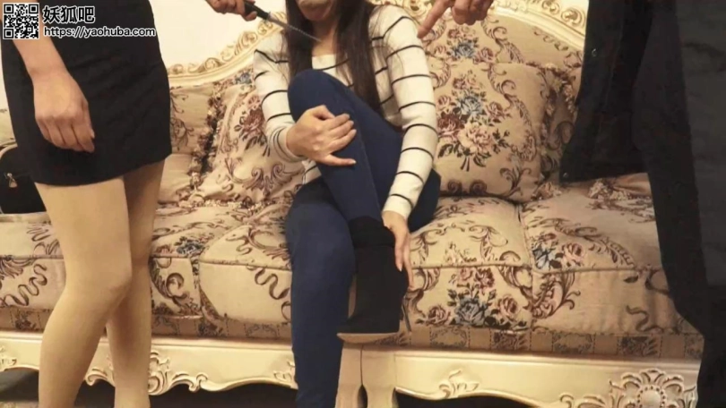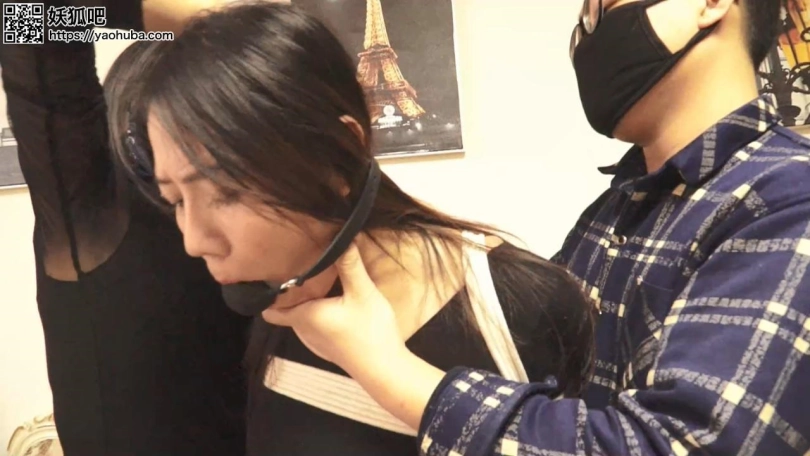 12. 为了不让李然吐出口中的裤袜,男劫匪给李然带上了口球,李然只能发出绝望的「唔唔」声。男劫匪开始搜集李然家中的财物,而夏炎脱下了口罩,用丝袜脚把李然夹着,抱住在沙发上玩弄。