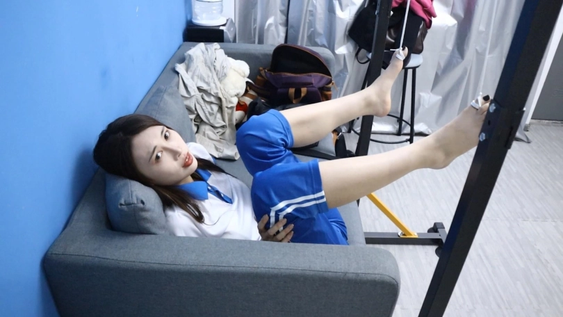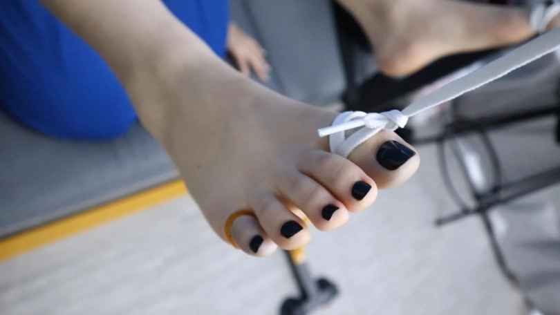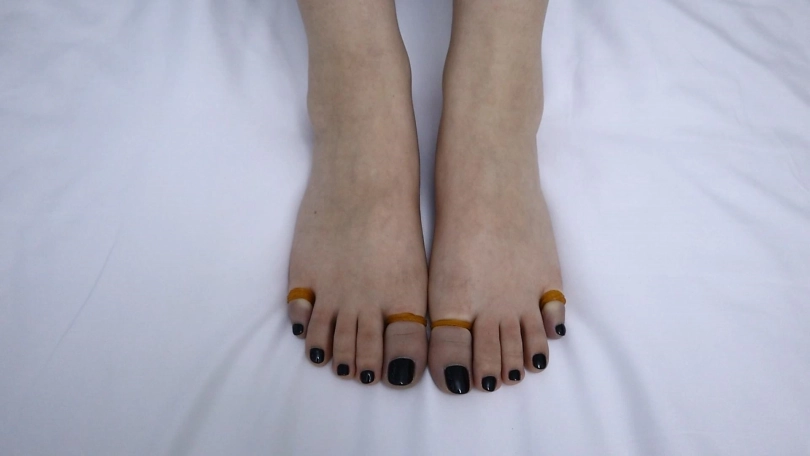 用皮筋牢牢捆住妹子的大脚趾和小脚趾,然后把脚趾吊起来,做出如此羞耻的动作,还有户外高跟鞋行走尝试,真的是超级刺激超级疼!!!刚绑上3分钟妹子的脚趾就紫了,拍到最后都已经颜色惨白没有知觉了,妹子表示超级疼超级疼!!!