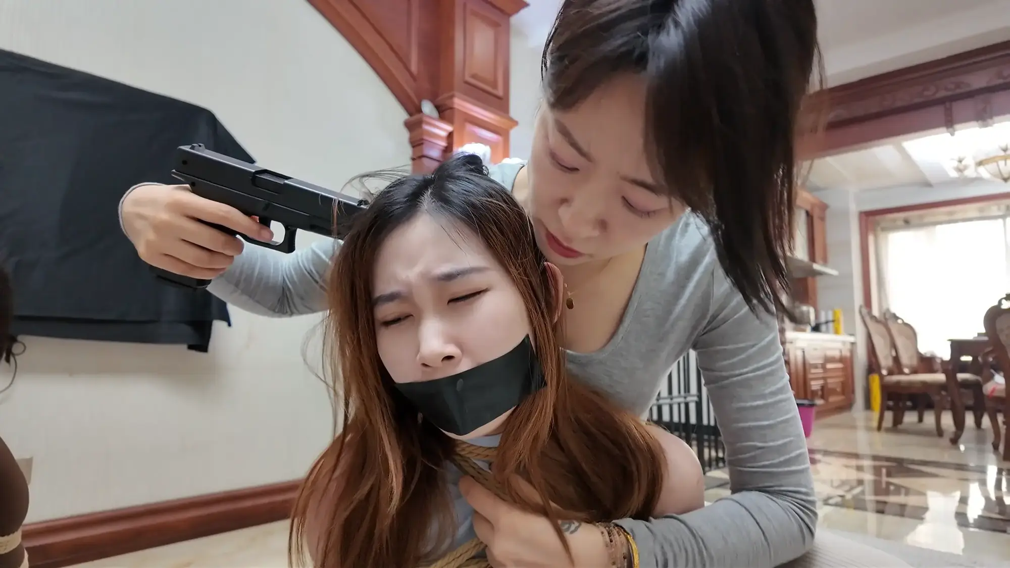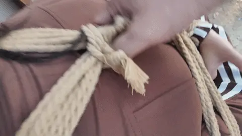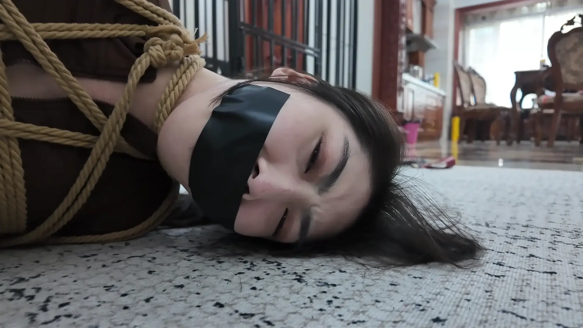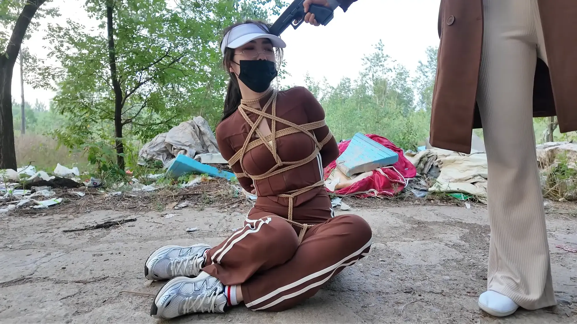 男人将汽车开到了一处空地,雨诺一直在看手机没有留意路线,她询问女人这是什么地方,女人二话不说掐住了她的脖子,前座的男人下车也上前拉扯她的衣服,慌乱之中雨诺一把推开男人,朝着远处逃跑,女人让男人先追自己在后座掏出了绳子也追了上去。雨诺边跑边喊救命,不慎被石头绊倒,两人上前控制住雨诺,女人拿胶布封嘴,男人将雨诺双手反扭,拿绳子把雨诺严严实实捆绑起来。绝望的雨诺被男人一把拽起,身边的女人拍打着她的屁股表示这次抓到的肉货身材真不错,为了保险起见女人脱下自己的外衣遮住雨诺身上的绳子,并给雨诺戴上了口罩并压着她向车走去。