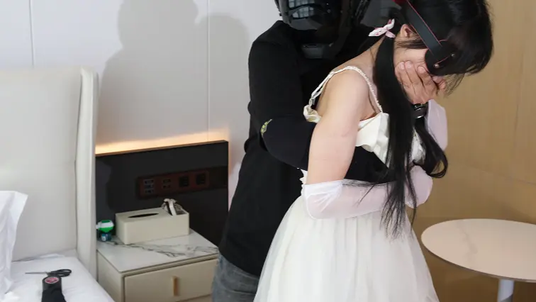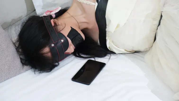 花嫁换上丝手套丝袜高跟鞋准备参加婚礼,被入室的歹徒挟持,用她换下的长筒袜堵住了她的嘴,胶带进行封嘴捆绑。随后歹徒出去应付其他人,花嫁开始挣扎,先是尝试用脚解锁手机呼叫新郎,但是因为嘴被封住无法讲出自己的位置,又尝试爬到门口用丝袜脚打开门把手,被赶回的歹徒发现,拉住脚踝拖回室内,踢蹬挣扎无效。