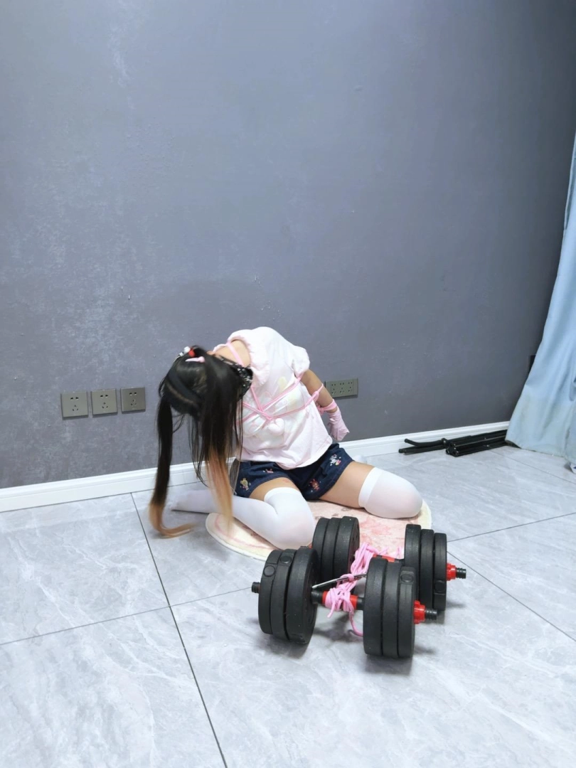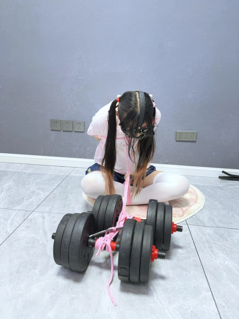 【全身拘束】:上半身用粉色棉绳绑日式,然后全身束缚成海老缚,盘腿拘束后,在脖子下方连接两个20kg共40kg的哑铃,并且把剪刀固定在哑铃上!