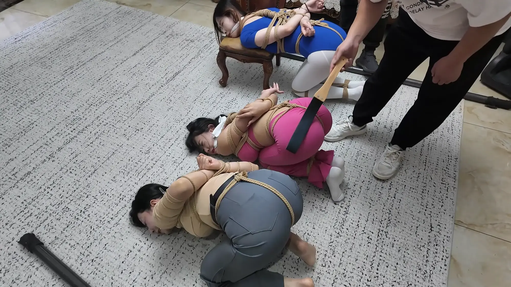 画面一转,被绑好的e小姐被丢在了沙发上,此时三个女人都被丝袜塞嘴,嘴上还被勒着一圈绳子,三人被神秘人一番玩弄后,脖子被绳子绑好连在一起,被神秘人拉着走向大门...