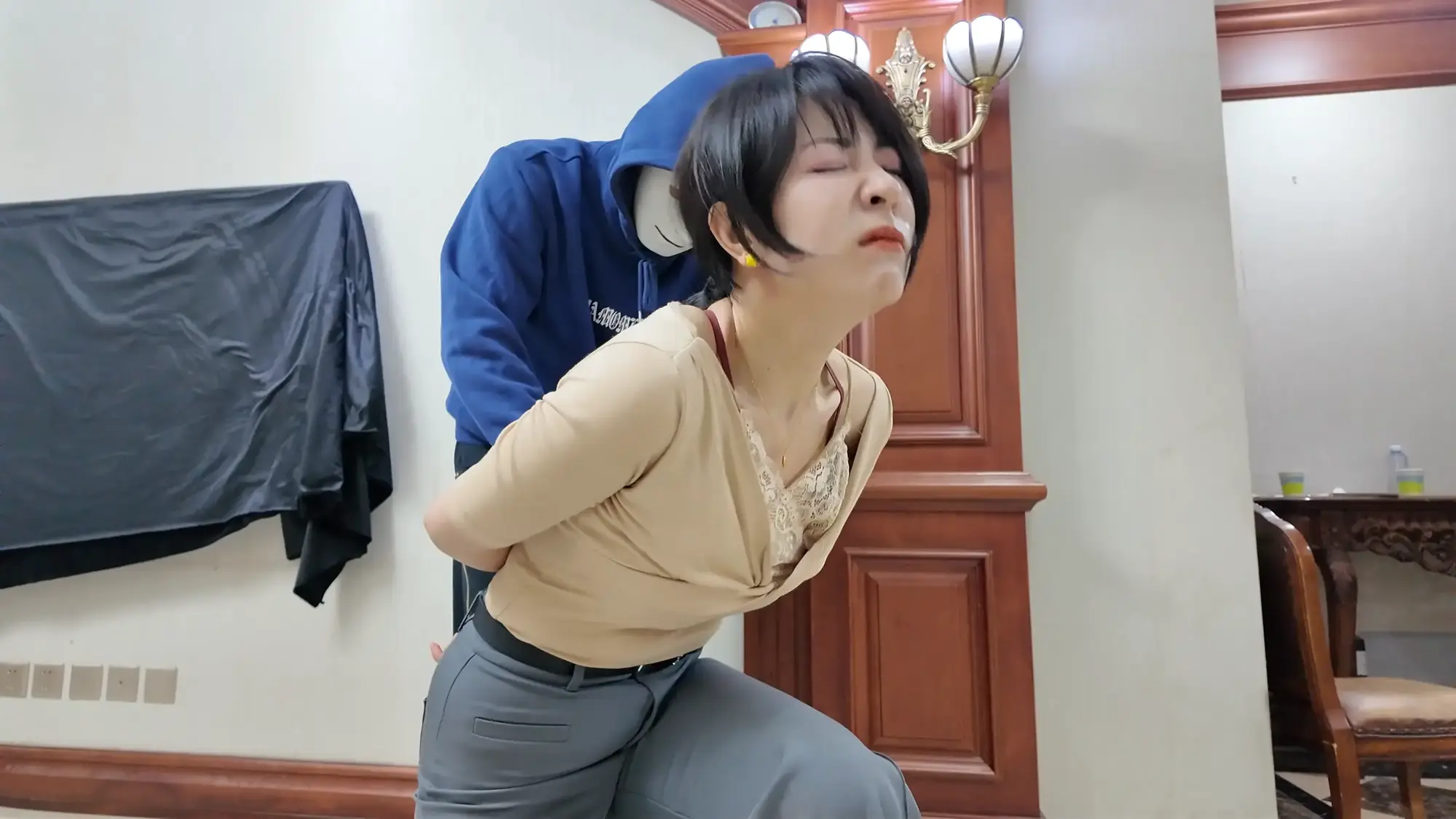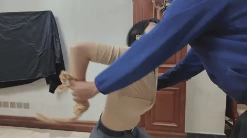 画面一转,雷姐被松开绳子,脱去了外衣,大哥用绳子将雷姐后高手紧缚,并将股绳用力绑上,痛得雷姐直叫,大哥见雷姐还是不肯屈服,便开始拉扯雷姐手臂的绳子,由于后高手绑的很紧,雷姐被绳子勒的非常痛,于是求饶,大哥见雷姐示弱,依旧没有停手,又开始恶趣味的拉扯雷姐的股绳,雷姐难受的大叫。于此同时,一旁的e小姐与南清再次被驷马捆绑放置在地上挣扎,e小姐环顾四周,发现了掉落在角落里的手枪,她短暂思考了后暗自窃喜,刻意大笑了起来,大哥甩开雷姐松开了e小姐的口球,质问她为什么笑,雷姐用挑逗的语气表示这么瞎折腾太浪费体力,耽误办正事,大哥乐呵着问e小姐是不是想替雷姐受罪,e小姐回复只要不伤害她,就随他们处置,见e小姐这么顺从大哥兴奋了起来,他站起身一拳将雷姐锤倒,抱起e小姐进了卧室。e小姐躺在床上用脚不停挑逗大哥,失去理智的男人慢慢凑近了e小姐,却不料e小姐突然一头将他撞倒,并顺势用手掐住了他的脖子,男人奋力挣扎还是被杀,e小姐挣脱了束缚缓缓走出卧室,见到小弟还在玩弄雷姐和南清,雷姐与南清看到挣脱束缚的e小姐,不停喊叫,但嘴被口球塞着无法说话,没有察觉的小弟被e小姐从背后扭断了脖子。e小姐开始玩弄两人,她先是抚摸雷姐的大胸,拉扯她的股绳,然后拍打雷姐的屁股,最后去另一边玩弄南清的脚与腿。过了一会儿,e小姐表示自己已经玩够,该带两人上路了,她捡起地上的手枪后突然神情凝重,呵斥躲在角落里的人出来。一位面具人现身,他夸奖了e小姐的本领,几番对话后e小姐得知神秘人是来劫货的,神秘人表示她们三个女人一个也逃不了,e小姐自信的举起枪准备了解了神秘人,却不料神秘人一发石子就将手枪打落,e小姐刚准备捡枪,神秘人已经冲上前一脚踩住,e小姐急忙后退,才发现眼前神秘人实力深不可测,接着神秘人又一发石子击中e小姐的腹部,他向前掐住跪倒在地的e小姐,用绳子将e小姐再次绑了起来。