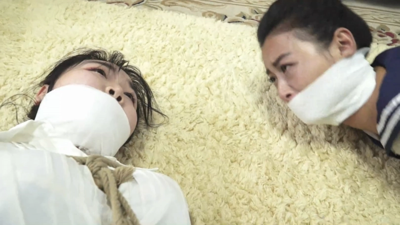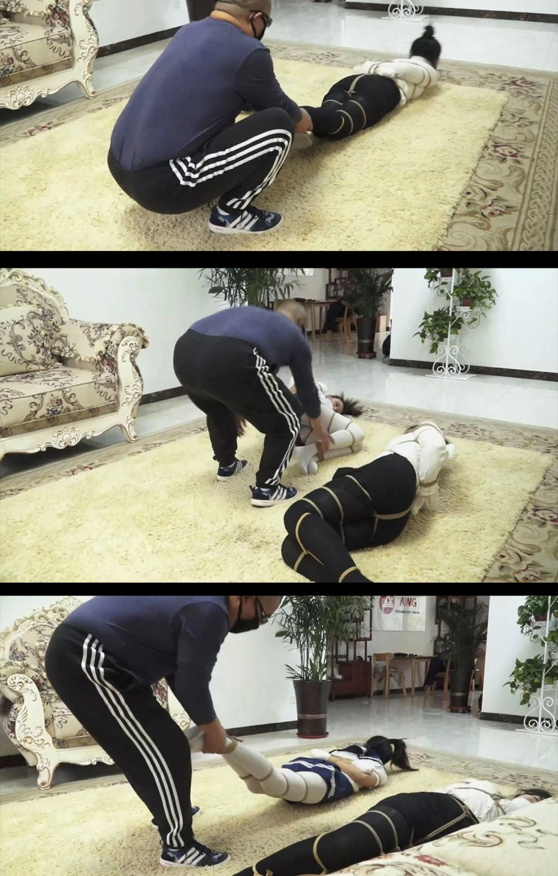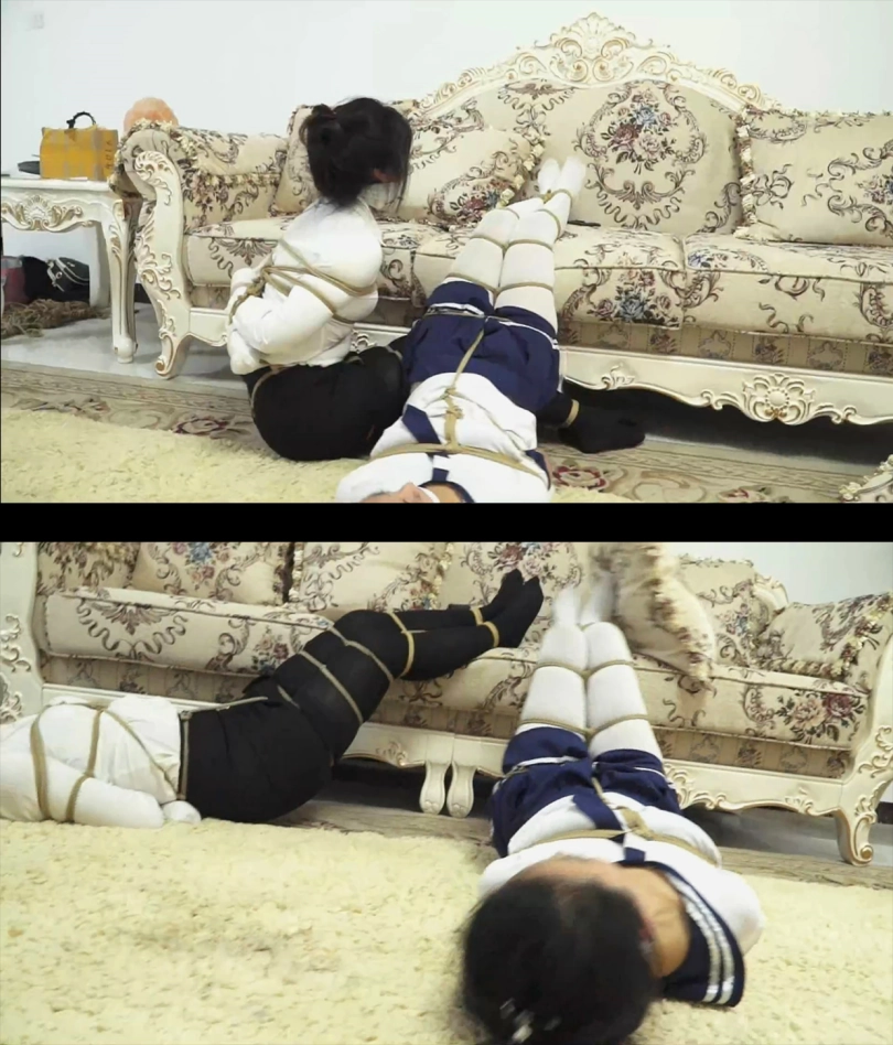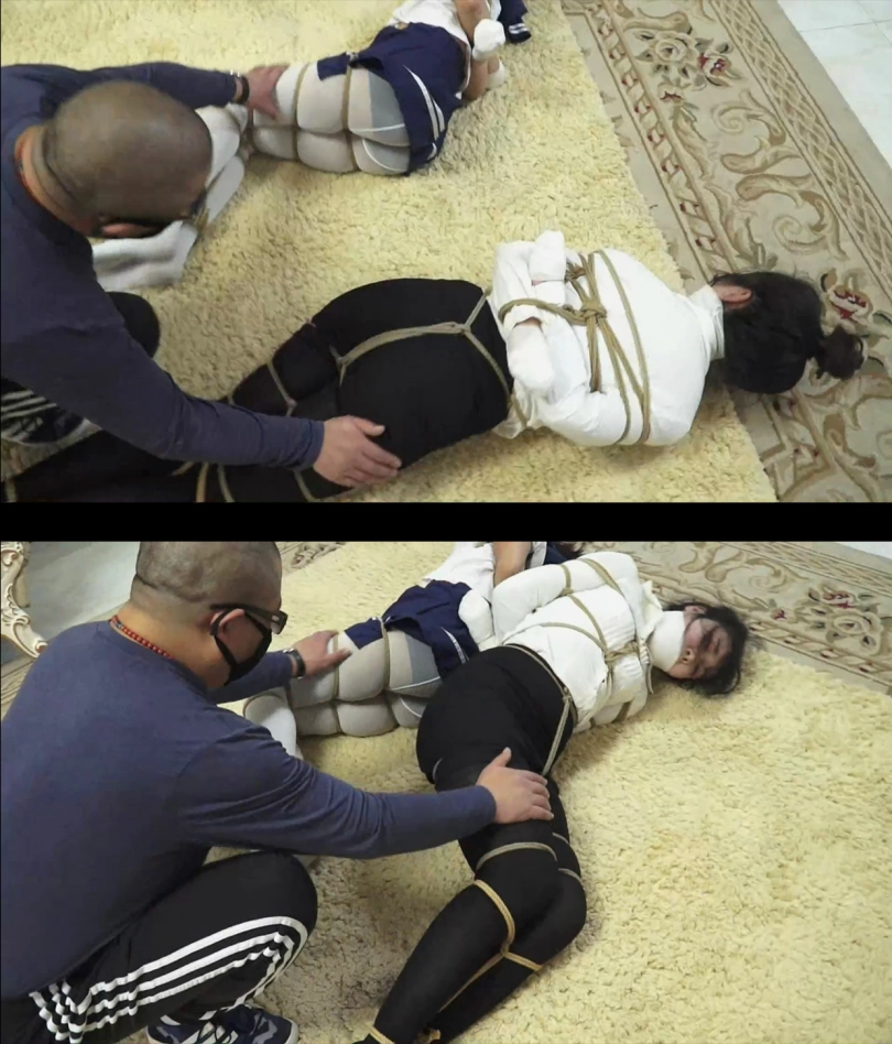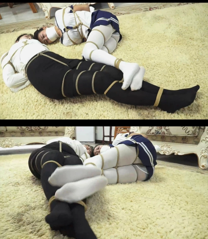 由于手指被包裹完全用不了,所以她们只能想办法用脚趾解缚,她们互相费力的抬起丝袜美腿想解开对方的绳子,但是她们可还穿着丝袜呢,光滑的丝袜脚趾根本无法解开结实的绳子。