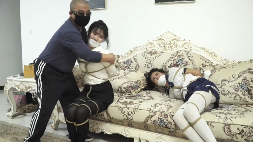 知道2个美女在求救后,男人气愤的决定要好好的惩罚她们2个,他用绳子把2个美女丝袜美腿的膝盖捆绑在了一起,这样她们就分不开了。