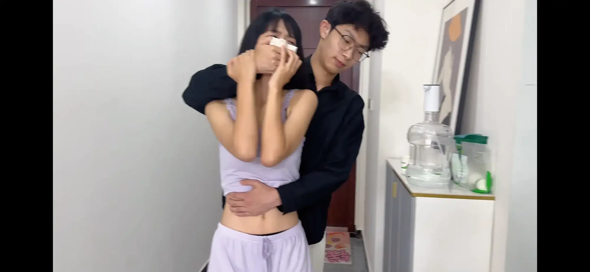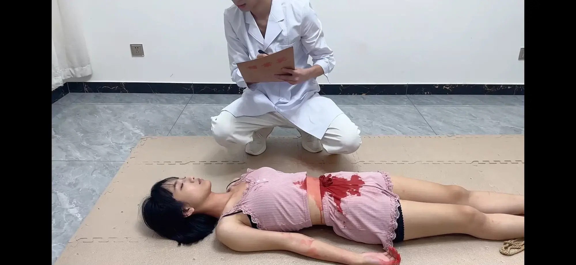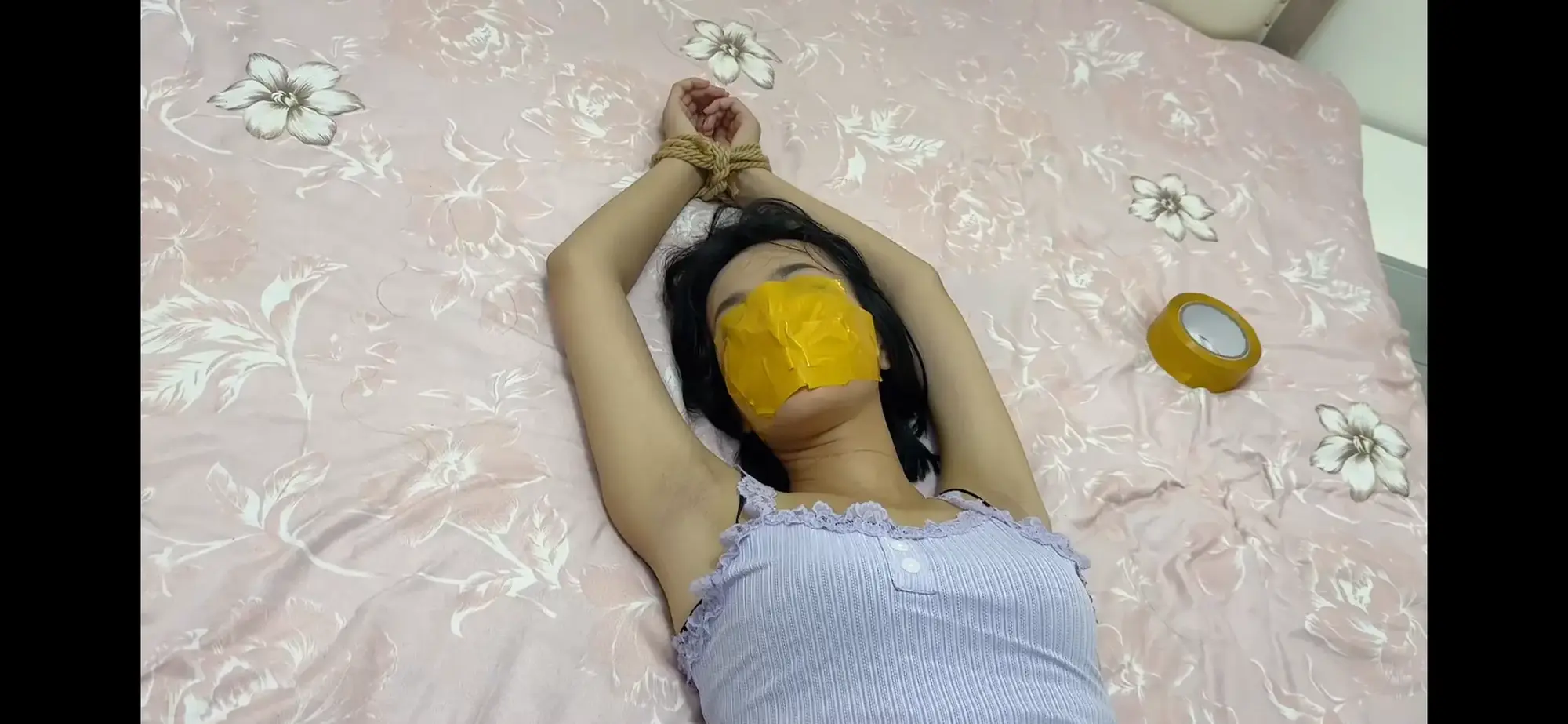 场景一:刘芳下班回家,在门口附近被尾随,小七捂住她的嘴挟持着她,用细绳子捆住她的手腕在体前,把她扔到床上。这时刘芳说着要报警,把小七激怒。拿起事先准备的黄色胶带一点一点的粘住她的面部(粘到眉毛下方)让刘芳不能呼吸。随着氧气一点一点的耗尽,刘芳挣扎的也越来越厉害,小七按住她的手腕举过头顶,刘芳两腿挣扎渐渐放下,被活活闷死。尸体状态为:刘芳手腕捆绑举过头顶,面部被胶带粘住,两腿呈开腿状耷拉在床下。【5分钟尸体姿势留两分钟】