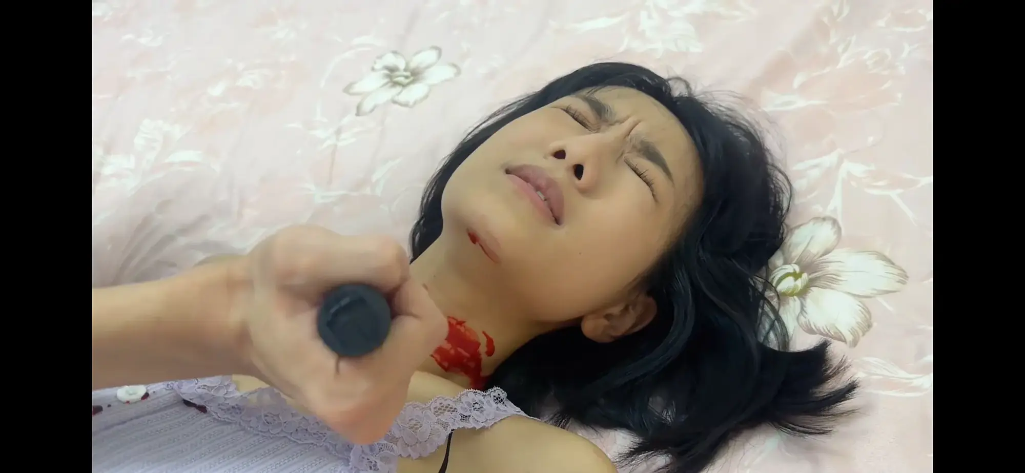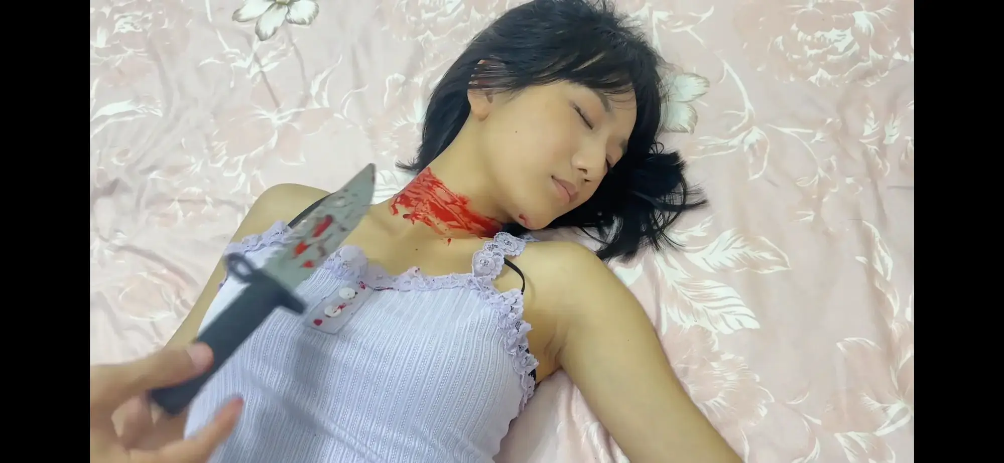 场景二:小七收到一个刺杀任务[X_X]一个官员情妇刘芳,他伪装成一个修理工,一路尾随刘芳到家门口。看见她进入屋内,借故叫开房门。刘芳领她进入屋内。小七趁刘芳不备从背后捂住她的嘴,劫持她来到卧室,并继续捂住她的嘴把她按在床上,用匕首朝其腹部连刺两刀,又用刀割破她的喉管将刘芳[X_X]。刘芳腹部衣服上有血迹,脖子处有血痕躺在床上,两腿耷拉在床下。【5 分钟,尸体留两分钟】