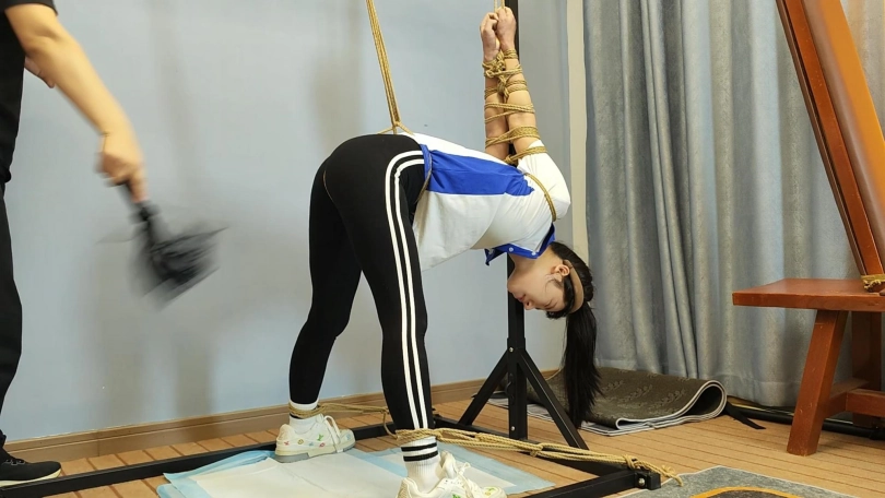十一在家做操,被潜入歹徒挟持,先体罚,又直臂倒绑到老虎凳上面调叫,直到失禁,水花四溅