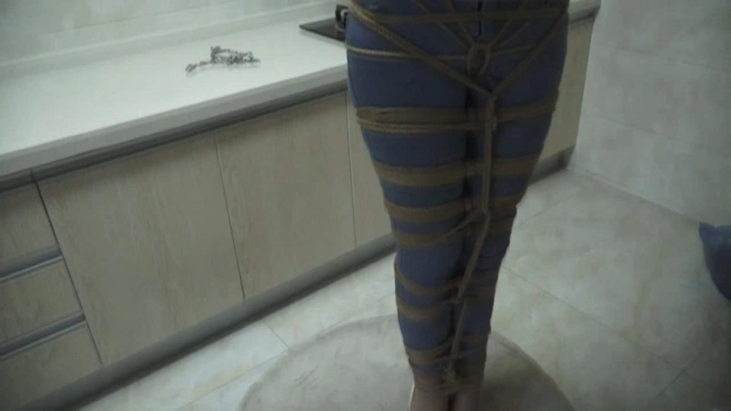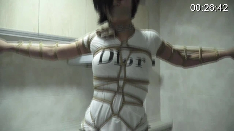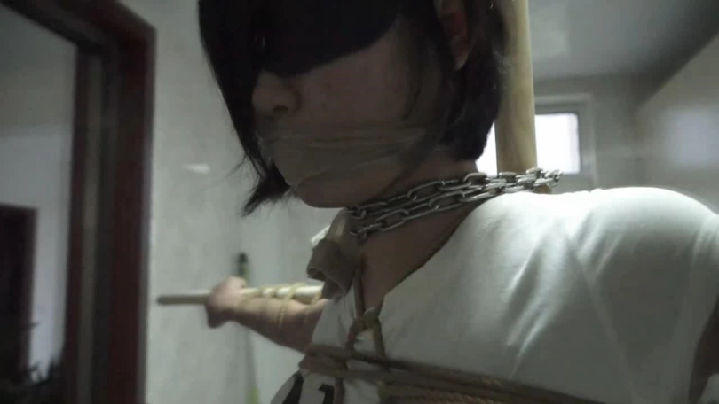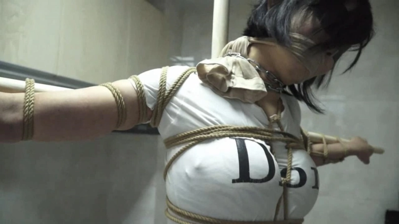 小欣被丈夫抱进了卧室,换上了他们第一次见面时的衣服,又被紧紧捆绑起来。等到小欣再醒来时,她已经被绑在一根木柱前,全身被绑好龟甲缚,双脚、膝部、腰部和胸部处都被捆在柱子上,脖子也被铁链缠住,。双臂被横着绑在一根木棍上,整个身子呈十字状。蒙眼的黑布和堵嘴依旧没有解开。