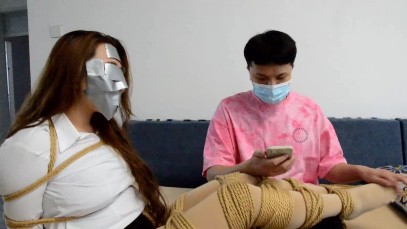 接着,弟弟便把丝袜堵回沐子的口腔,更在茶几下拿出了一卷银色的胶带,在沐子的面上贴了10张,把沐子的整个面部也贴成了银色。