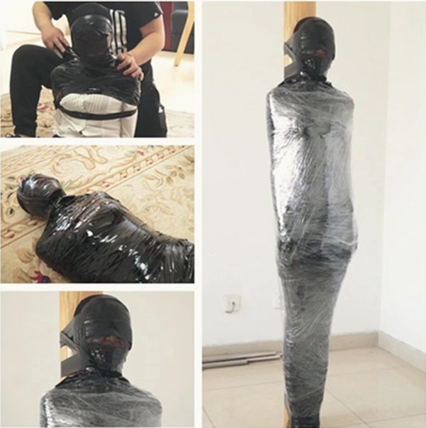 白领被黑丝袜蒙住头,胶带蒙眼堵嘴后,又被黑色胶带一圈一圈裹成了木乃伊,毫无逃脱可能。最后被封在木柱上,用胶带和保鲜膜固定,只能像一件展品一样供人观赏了......