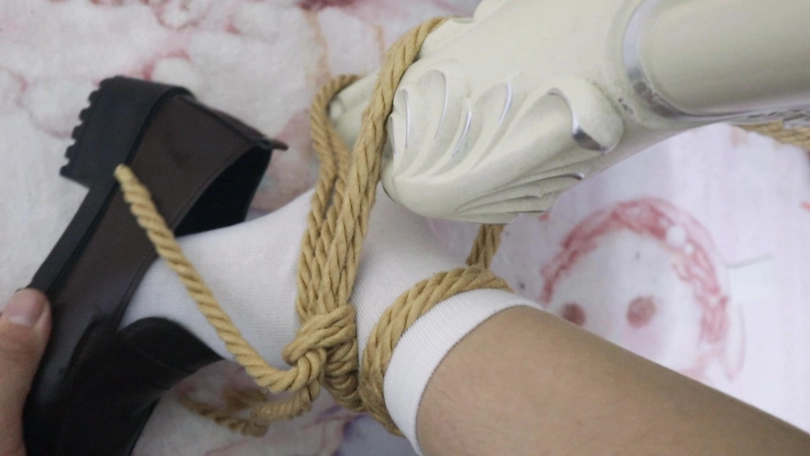穿着皮鞋的白棉袜双脚被固定在床头柜的两个柱子上剥夺感官