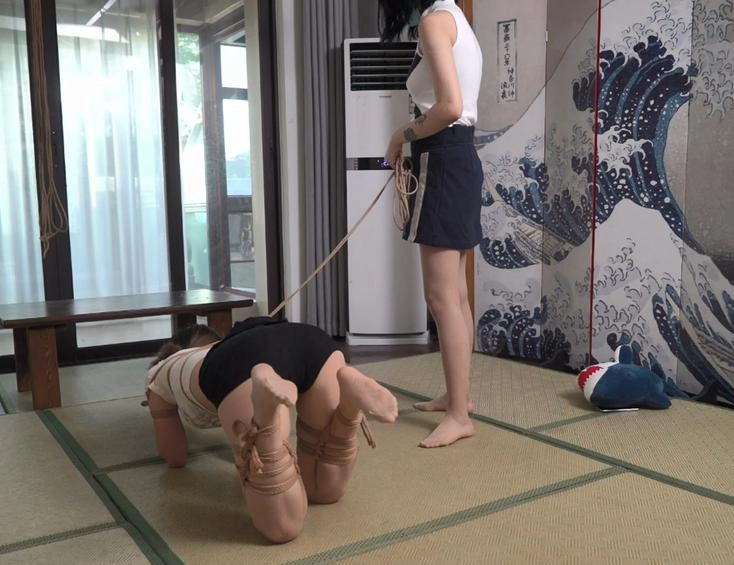 嗷嗷被捆成犬缚,一根绳索牵着她的脖子,牵着她让她爬着不停的转圈圈..