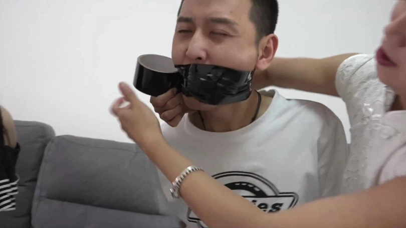 文清分别拿黑色宽电工胶布剪下5张封在夫妻二人嘴外,黑色胶带缠绕5圈,最后又拿黑色弹力自粘绷带缠绕5圈,把夫妻二人嘴给封堵严实。