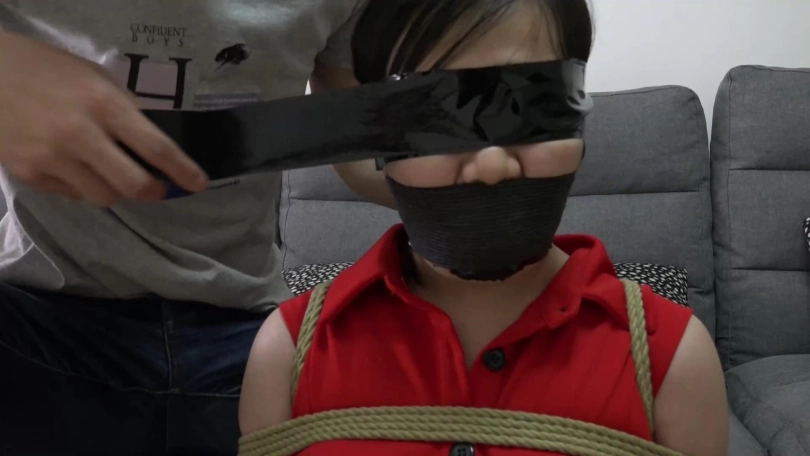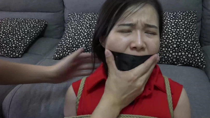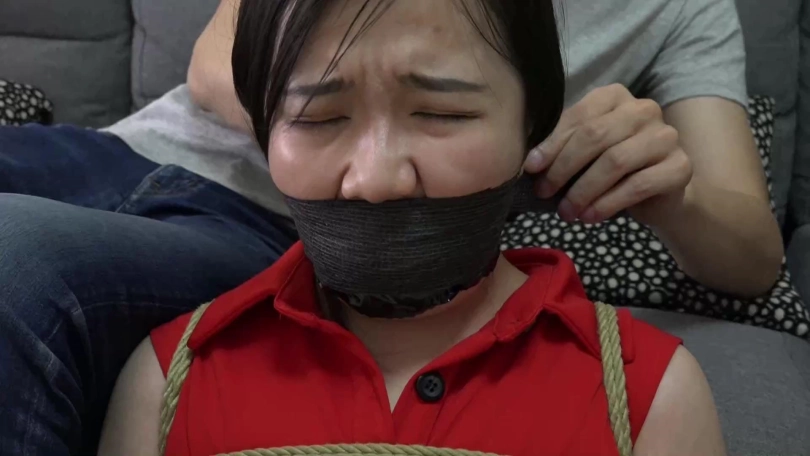 小雨艰难挣扎,却碰上返回的男友,将其更加严厉捆绑起来,并被男友拿小雨自己穿过没洗的一条紫色原味内裤塞入口中,用胶布绷带多圈缠绕封死。