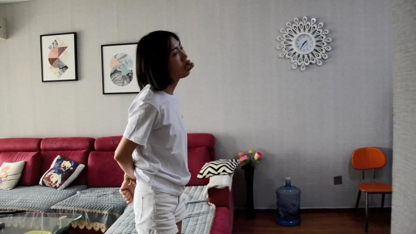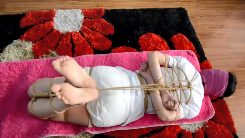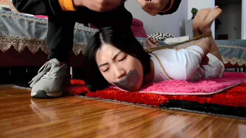 很快,劫匪将小鱼五花大绑,双腿与脚踝并拢捆绑多道,驷马后放置在客厅沙发前地上。