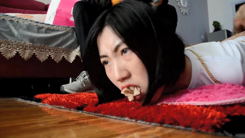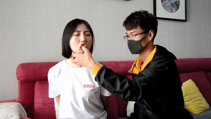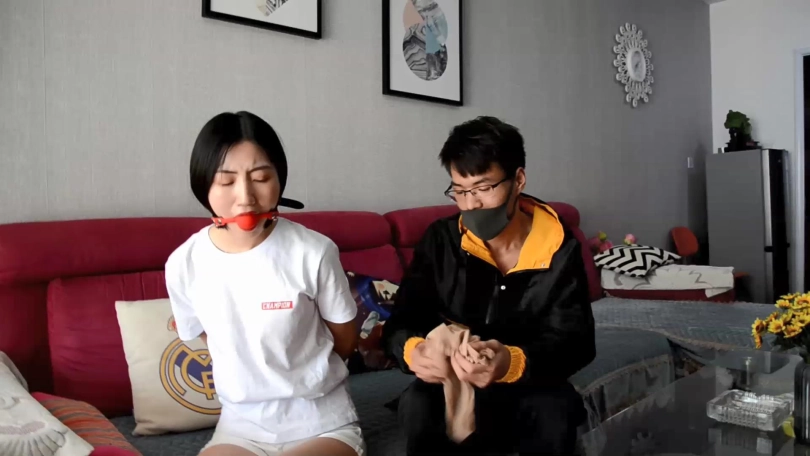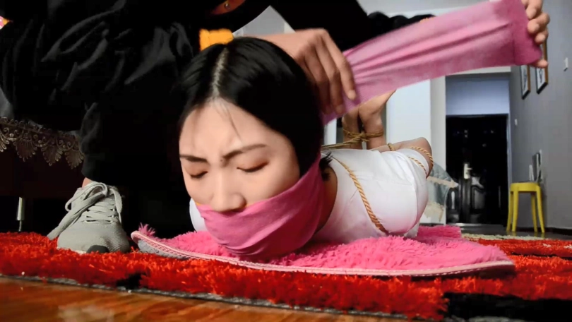 情节:小鱼在家遭遇入室抢劫,劫匪将其双手反绑,脚踝捆绑后给其带上塞口球。