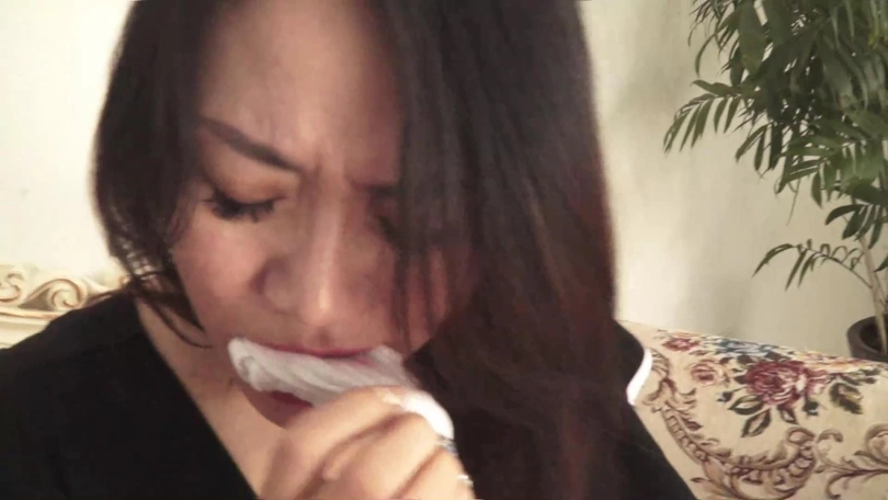 劫匪取下王蕾嘴里口球,让王蕾张嘴,王蕾:不要,脏!劫匪同样捏住她的鼻子迫使她张嘴,把两只深灰色锦纶丝袜一只只塞入王蕾口中,塞得王蕾直恶心,劫匪:怎么样,我的袜子好不好吃?随即王蕾也跟李然一样被绿色电工胶布与紫色自粘绷带缠绕封嘴。