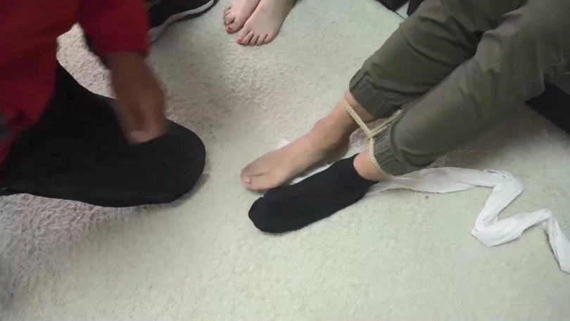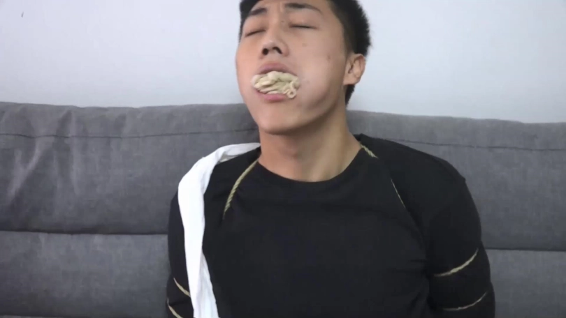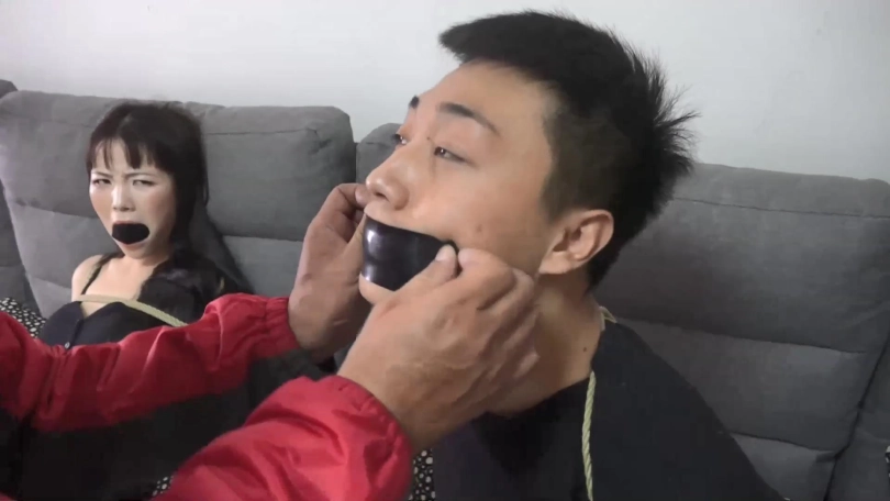 劫匪拿绳索把文冰捆绑好,嫌文冰话多,脱掉文冰男友脚上的黑色棉袜,把臭烘烘的棉袜塞入了文冰的小嘴里,塞得文冰直恶心。而后劫匪用黑色宽胶布封别封在文冰和文冰男友的嘴巴外。