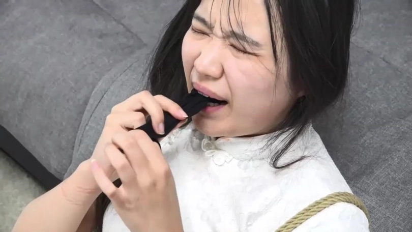 片段5:逃脱未遂被劫匪捆成驷马臭连裤丝袜套头的美女小楠,最终在黑暗中奋力挣脱束缚,撕掉封眼绷带与胶带,一点点撕掉封嘴绷带、胶带、黄色宽胶布,拽出口中自己脚上穿过没洗的一双白色锦纶丝袜,“我饶不了你!”